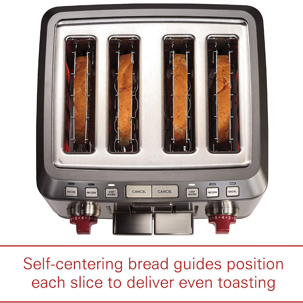 - Guides de pain auto-centrés : grillez les pains les plus fins aux plus épais en toute confiance. Chaque tranche est parfaitement droite et centrée pour garantir un brunissement uniforme.