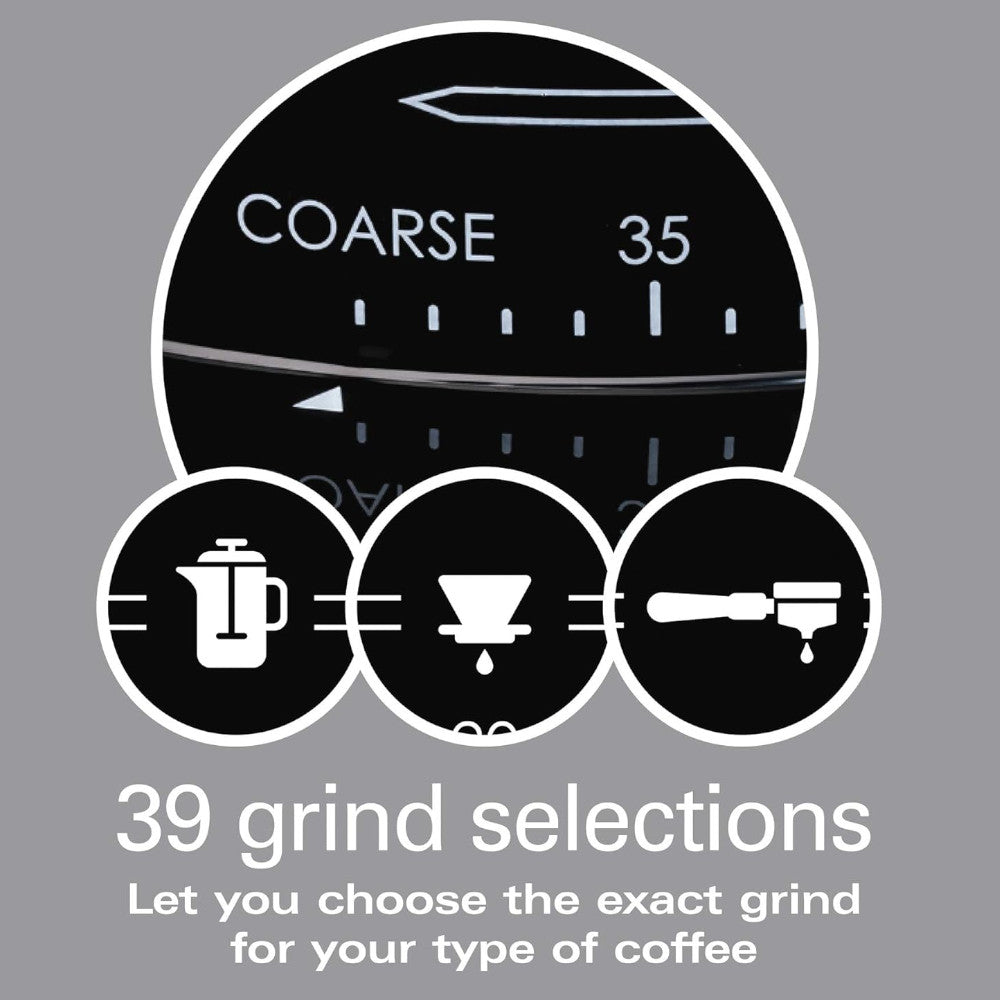 - 39 GRIND SELECTIONS. This conical burr coffee grinder with adjustable grind settings (coarse, medium & fine) lets you choose the exact grind for every type of coffee.