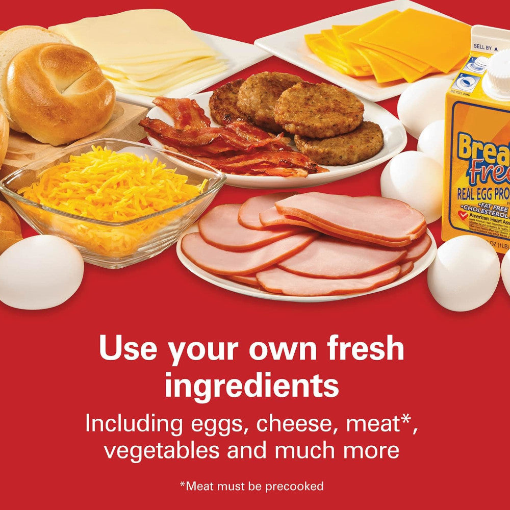 Chaque sandwich peut être personnalisé selon les goûts de chacun, afin que chacun puisse avoir son préféré. Construisez simplement la base de vos sandwichs dans la couche inférieure, placez l'œuf et les couches supérieures de vos sandwichs sur les plaques de cuisson supérieures et fermez le couvercle. En seulement 5 minutes, vos sandwichs du petit-déjeuner sont prêts à être dégustés. Vous saurez exactement quand le petit-déjeuner est prêt grâce au compte à rebours : il émet un bip lorsque les sandwichs sont prêts. Besoin d'inspiration ou de recettes pour vous lancer ?
