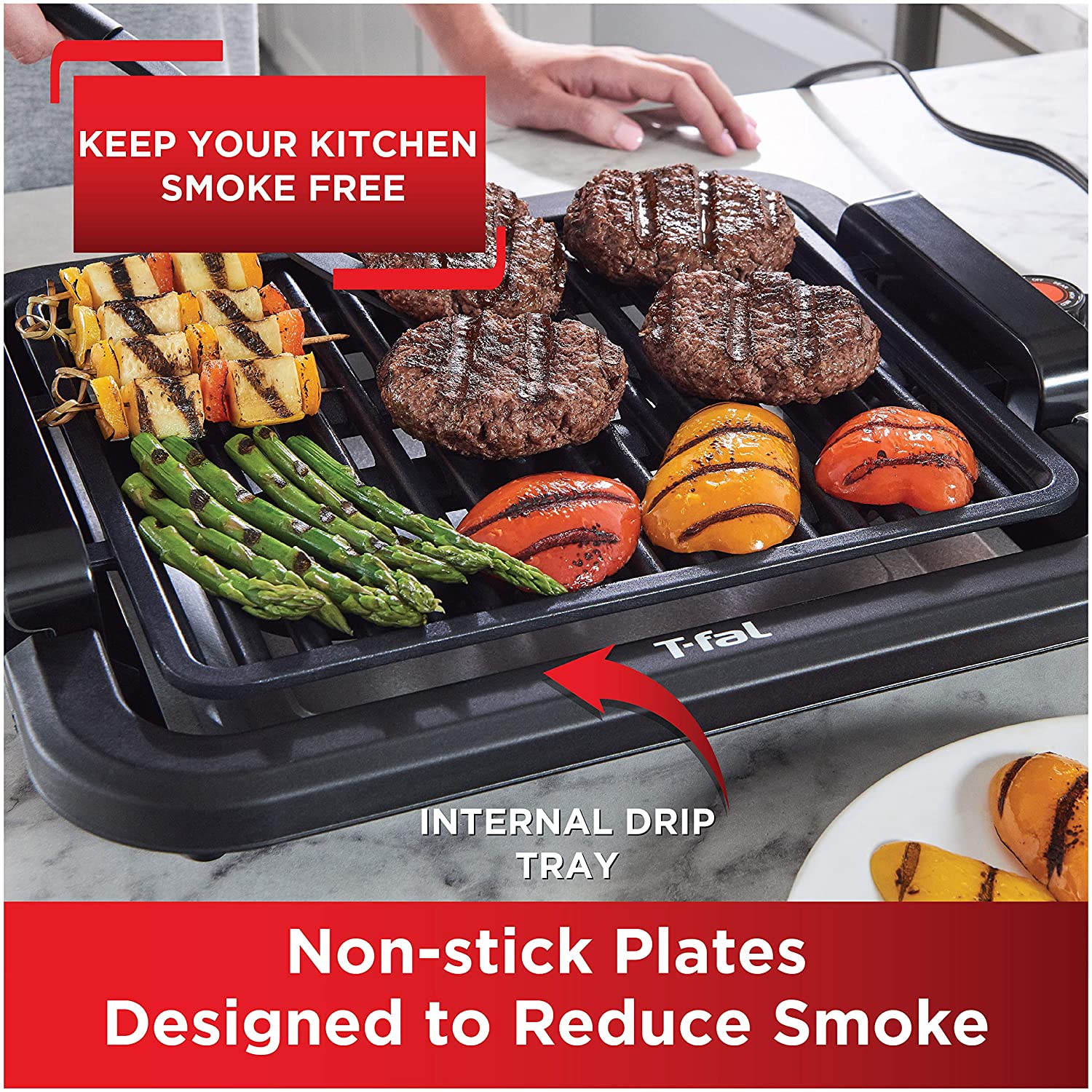 Savourez vos grillades préférées toute l'année avec le gril antiadhésif d'intérieur sans fumée T-Fal. Équipé d'une puissance de 1 200 W et de cinq réglages de température, vous pouvez saisir, griller et garder vos aliments au chaud dans le confort de votre cuisine. Ce gril est doté d'une plaque antiadhésive, de poignées froides au toucher et d'un bac d'égouttement intégré pour faciliter la cuisson.