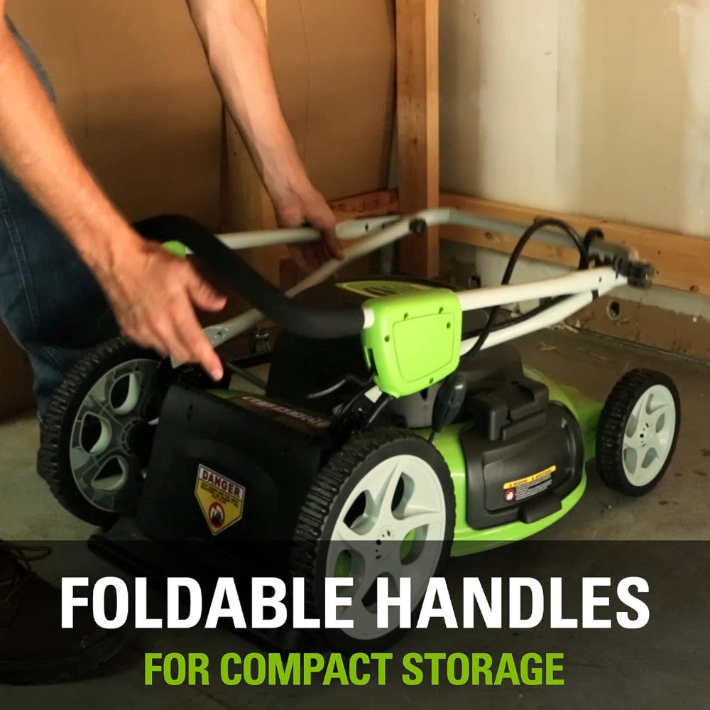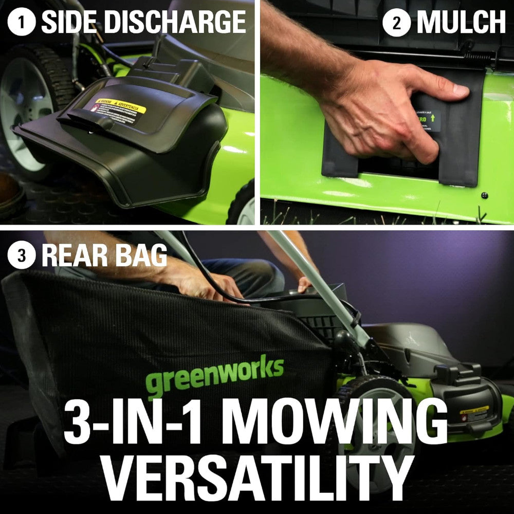 Greenworks 25022 Caractéristiques : Capacités de tonte 3 en 1 : paillage, collecte arrière et éjection latérale.