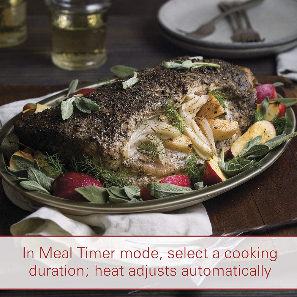 Un autre réglage spécial garantit que vous ne ferez plus jamais trop cuire un morceau de viande ; il cuira vos aliments à la température exacte que vous spécifiez à l'aide d'une sonde de température incluse, ce qui permettra d'obtenir des côtes sans os et des jarrets de porc appétissants.