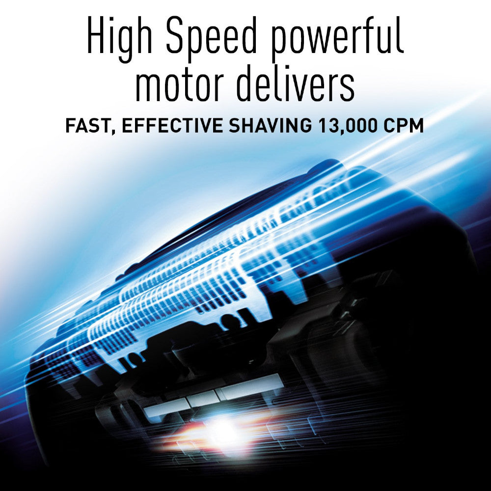 - La tête pivotante du rasoir glisse sans effort sur le visage, le menton, la mâchoire et le cou et un moteur linéaire de 13 000 cpm maintient des performances optimales tout au long de la charge de la batterie.