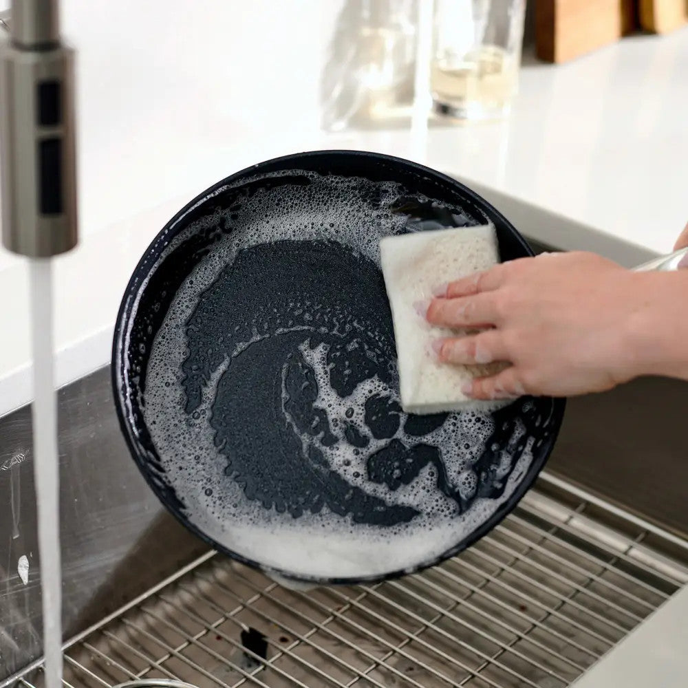 To preserve the nonstick coating, hand washing with soap and a sponge is recommended. Use only silicone, nylon, or wooden utensils.