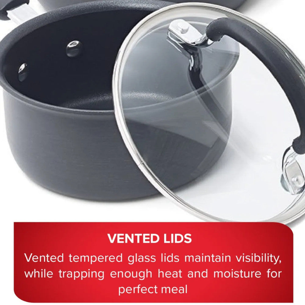 - Riveted handles & vented lids: Riveted silicone handles are designed for comfort and safety; vented tempered glass lids maintain visibility, while trapping enough heat and moisture for perfect results every meal