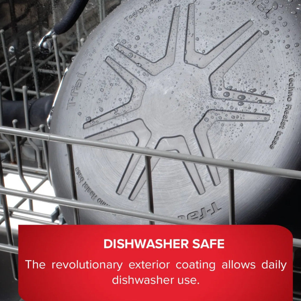 The revolutionary exterior coating allows daily dishwasher use while maintaining T-fal Ultimate’s Hard Anodized satin grey appearance.