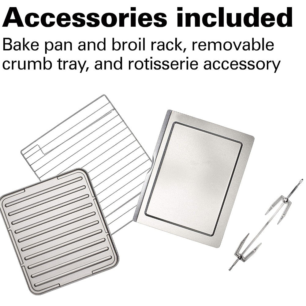 - Includes metal mesh basket for air frying, bake pan, broil rack, and 3 rack positions