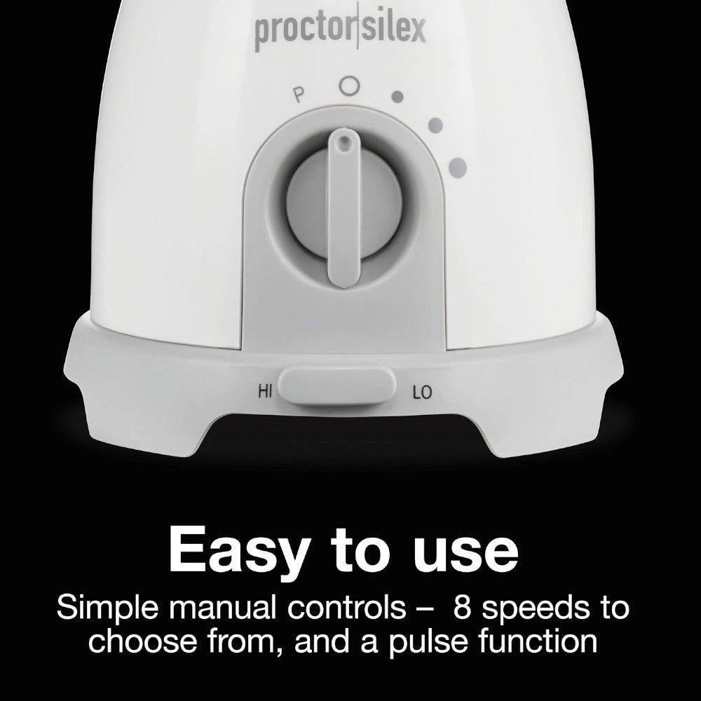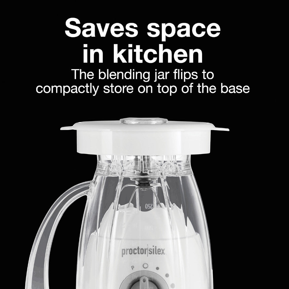 The Proctor Silex® Easy-Store Smoothie Blender saves space in the kitchen because the blending jar flips to compactly store on top of the base, taking up less space in the kitchen, whether you keep it on the countertop or store it away in a kitchen cabinet.