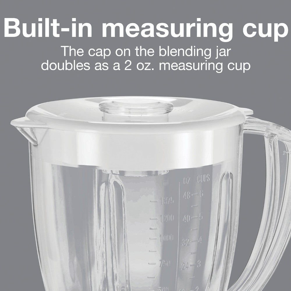 The blades are made to last of durable stainless steel. The cap on the blending jar unscrews and doubles as a small 2 oz. measuring cup for added convenience.
