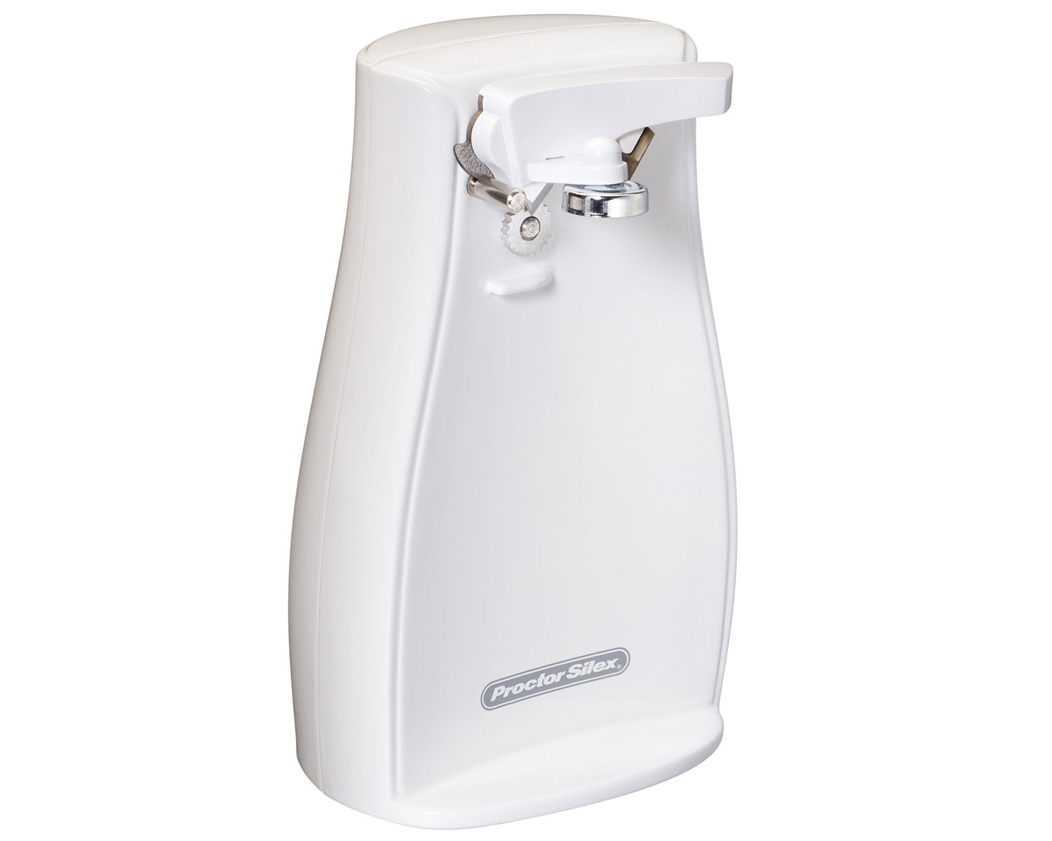 The Proctor Silex® Power Opener™ Can Opener is designed with quality in mind to efficiently and easily open many different-sized cans, without being complicated to save you time in the kitchen. Built-in features include a twist-off cutting lever for easy cleaning, a knife sharpener, and a cord storage area. This electric can opener is very easy to use and has a handy auto shutoff feature, which lets you open cans hands-free.