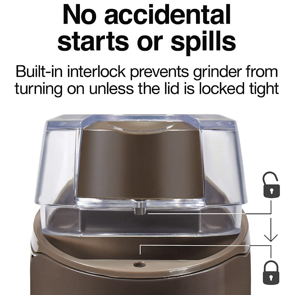- NO ACCIDENTAL STARTS OR SPILLS: The built-in interlock prevents the coffee bean grinder from turning on when the safety on/off button is pressed unless the lid is locked securely in place.