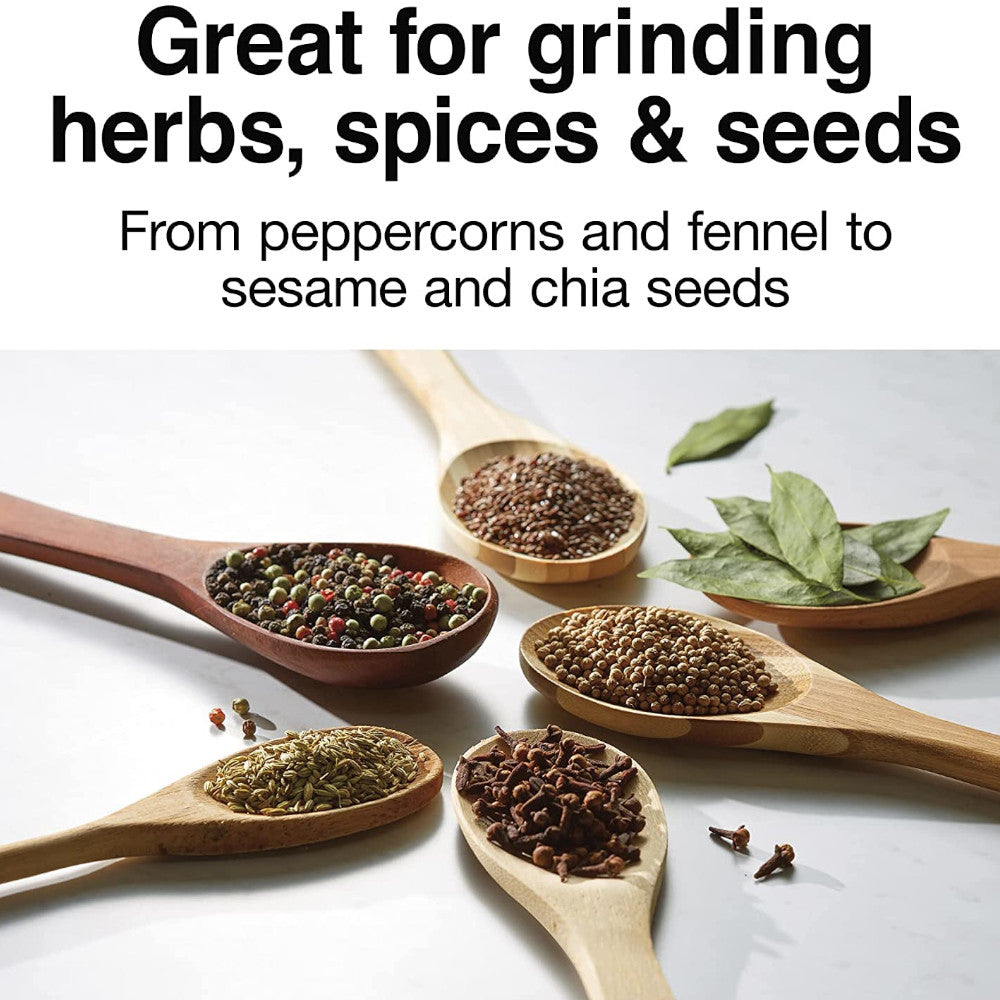 - GREAT FOR GRINDING HERBS & SPICES: Conveniently grind peppercorns, fennel and other herbs and spices for recipes or to keep on hand in the kitchen. Also great for grinding sesame, flax, chia and other seeds for smoothies, protein shakes or to add to food.