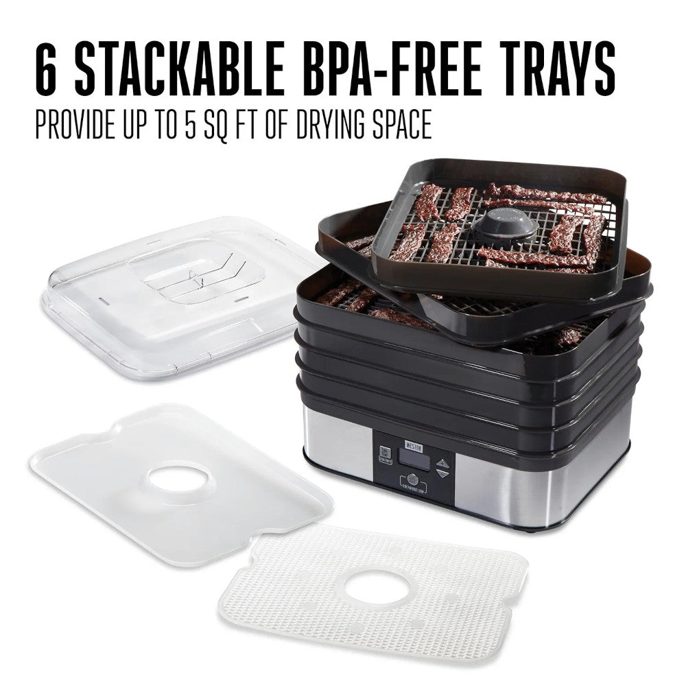 The Weston® 6 Tray Digital Food Dehydrator has up to 5 sq. ft. of drying space, adjustable temperature control and digital timer with auto shutoff. The 500 watt base-mounted heater and quiet fan provide even drying without rotating the trays.