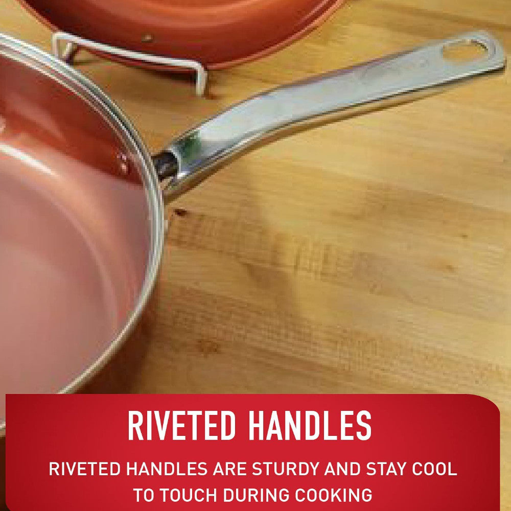 - Riveted stainless steel handles: Stay cool on the stovetop and provide a comfortable, secure grip, even when wearing thick oven mitts