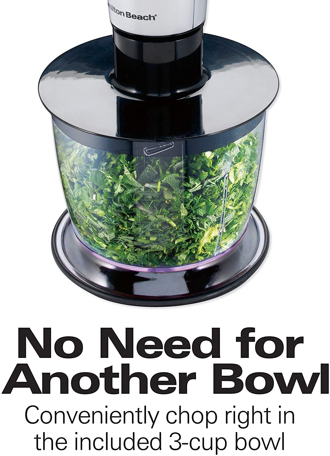 The Hamilton Beach Hand Blender with Whisk and Chopper is an extremely convenient choice when you need to blend, chop, mix, or whip. This hand blender lets you do all these things right in the cooking pan, bowl or even the glass, which means you don't need a separate mixing bowls. The stainless steel whisk that this hand blender features is the height of versatility. Besides the whisk and the blending wand, this blender also features a chopping bowl for added convenience.