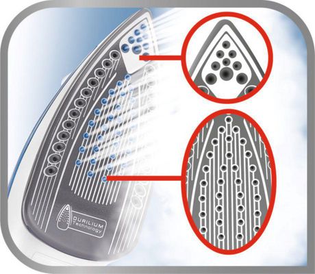 Delivering quick and efficient results, the Durilium® Technology adds two exceptional tools to the ironing arsenal: active steam holes located on the tip, sides, and even the center of the soleplate for maximum steam distribution.