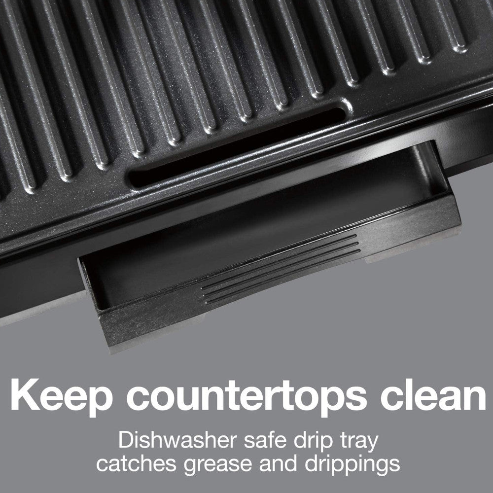- KEEP COUNTERTOPS CLEANER: The drip tray on the electric grill catches grease and drippings to eliminate mess. When finished cooking, just slide it out and put it in the dishwasher.