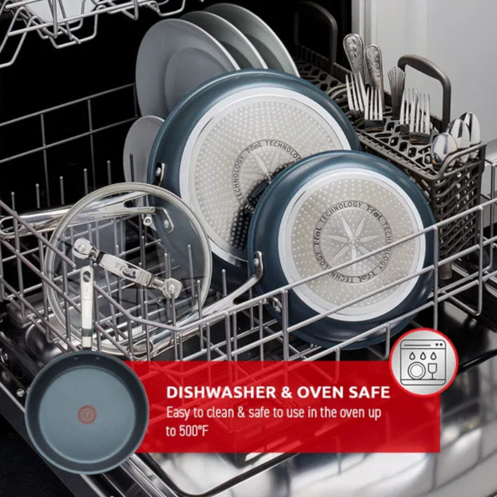 - Easy Cleaning & Oven Safe: Cleaning your T-fal Platinum non-stick cookware is wonderfully easy: wash in warm soapy water using a cloth, sponge, or non-abrasive scouring pad, alternatively you can place it vertically in the dishwasher as its dishwasher safe making clean-up of your cookware super easy. T-fal Platinum non-stick is oven safe up to 500°F which makes it perfect for oven-baked stuffing, omelets, or butter tarts. With the proper care, you can anticipate many years of superior cooking performance and easy cleaning.