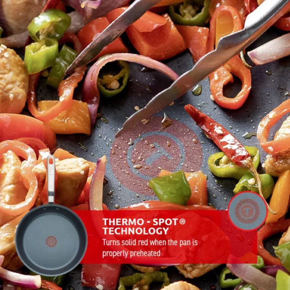 - T-fal’s Unique Thermo-Spot® Heat Indicator: No more inadequately browned meats or potatoes or salmon that aren’t crisp enough because you were cooking in a pan that wasn’t properly preheated. Thermo-Spot® indicates exactly when your pan has reached the perfect cooking temperature. When the Thermo-Spot® pattern disappears, your pan is perfectly preheated, and you may start cooking giving you perfect cooking every time – crispy on the outside and juicy inside. Thermo-Spot® technology will also help to prevent your pan from overheating, preserving the non-stick performance for a lifetime.