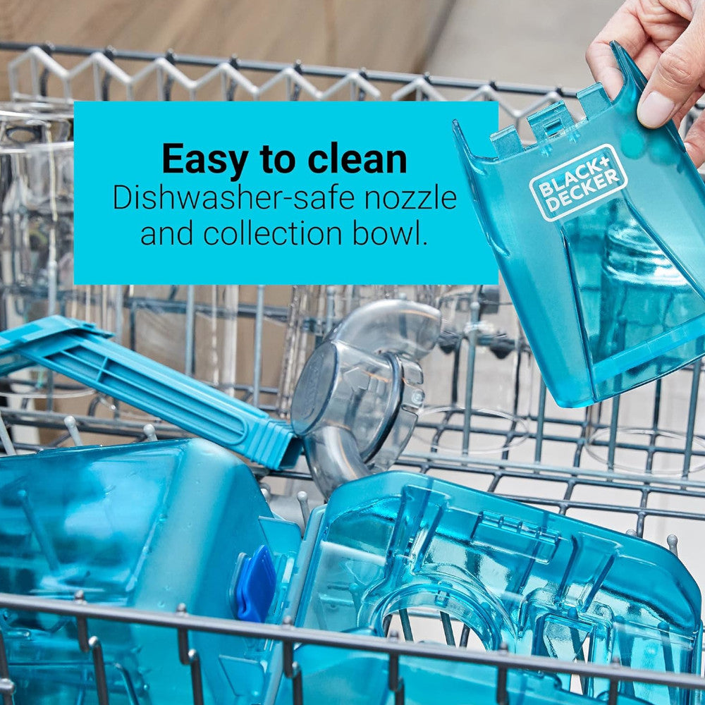 - Dishwasher-safe collection bowl (remove foam filter) and vacuum nozzle - top rack only.